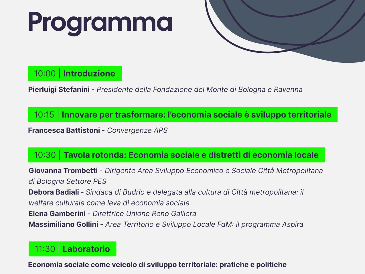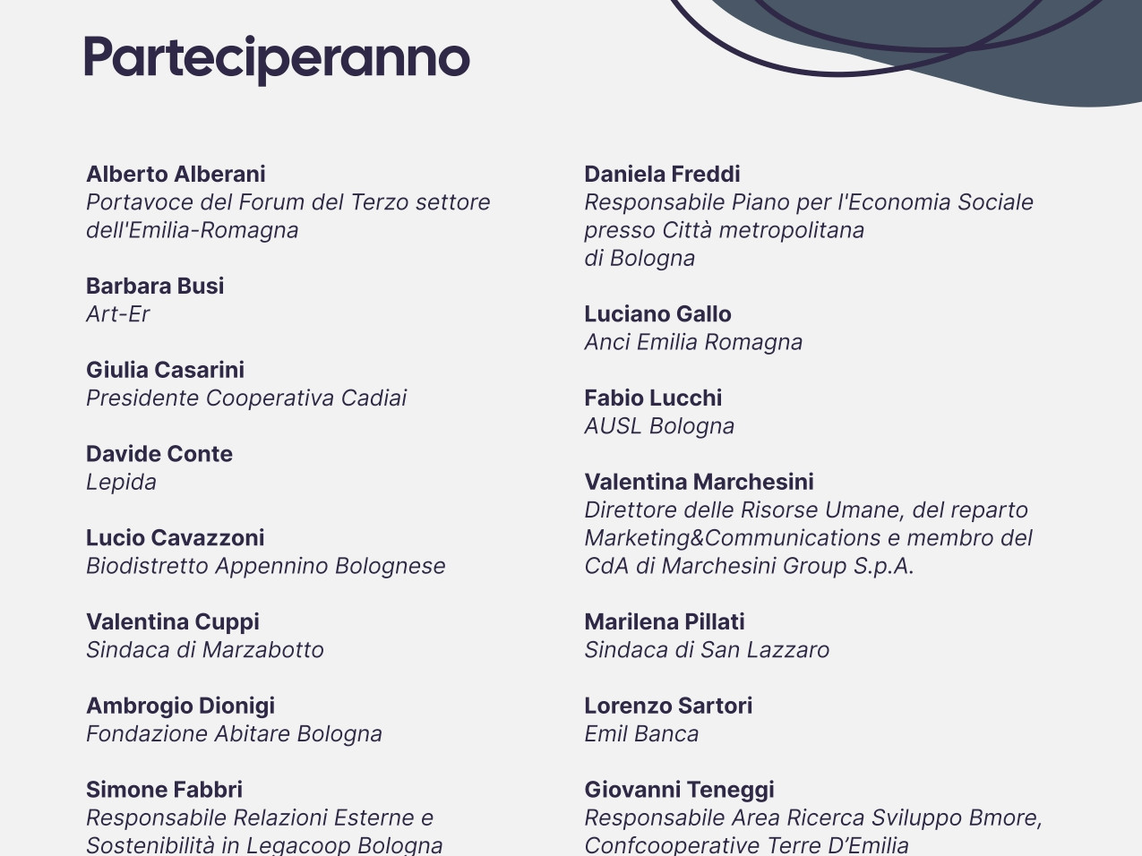 Particolare attenzione sarà dedicata agli ambiti della salute, dell’energia rinnovabile e cura dell’ambiente, della cultura e istruzione, delle filiere del cibo e dell’abitare, per individuare strategie e modelli capaci di generare impatto sociale e sviluppo territoriale duraturo.